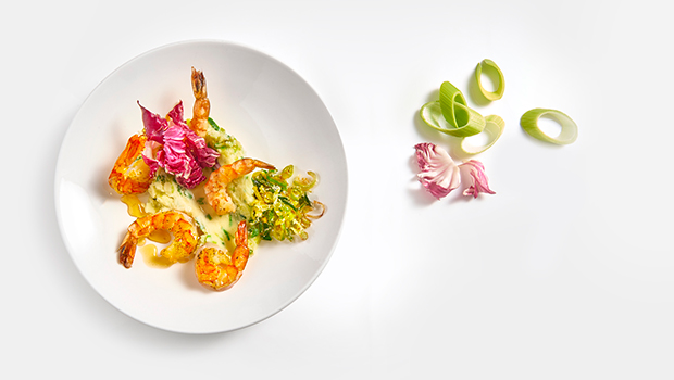 - Verdeel de preistamppot en de sla over de borden. Serveer de stamppot met de garnalen en de gebakken prei. Garneer met de honing.